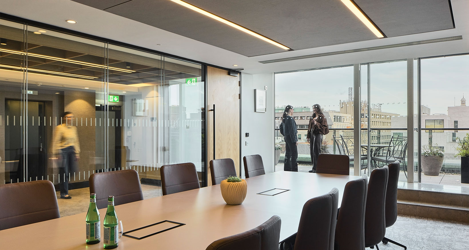 The Penthouse at 2 Hume Street is a fully-furnished, self-contained office located adjacent to St. Stephen’s Green in Dublin. The available workspace is situated on the fourth-floor and is designed to support flexible working, with a combination of open-plan areas, collaborative zones, and private spaces for individual focus. The office includes a dedicated kitchen, comms rooms, toilets, employee lockers, and a impressive rooftop terrace.